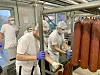 Bildet: Til daglig jobber de med helt andre ting. Dugnaden i fabrikken ble en lærerik opplevelse for Jan Tore Flak (fabrikksjef), Espen Stav Hansen (PU-direktør), Monica Eik-Nes (direktør forretningsutvikling) og Thomas Mjølhus (business controller). I forrige uke ble de plassert i helvare-avdelingen for å bidra med vakuumering av hel spekepølse. (Foto: Grilstad AS)