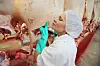 Bildet: Nakkefettet varmes opp på slaktet og den ferdig trente ansatte lukter, og tildeler i løpet av noen sekunder en poengsum per slakt. Foto: Vion